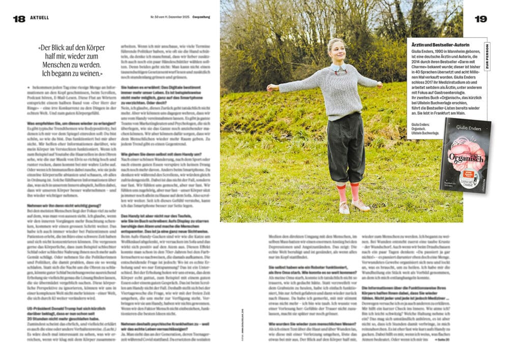 In der Dezemerausgabe der Coopzeitung ist das Titelthema Giulia Enders. Das Portrait der Autorin und Ärztin stammt von Katrin Binner/laif. Im Innenteil sind zudem zwei Bilder von Anna Ziegler/laif.