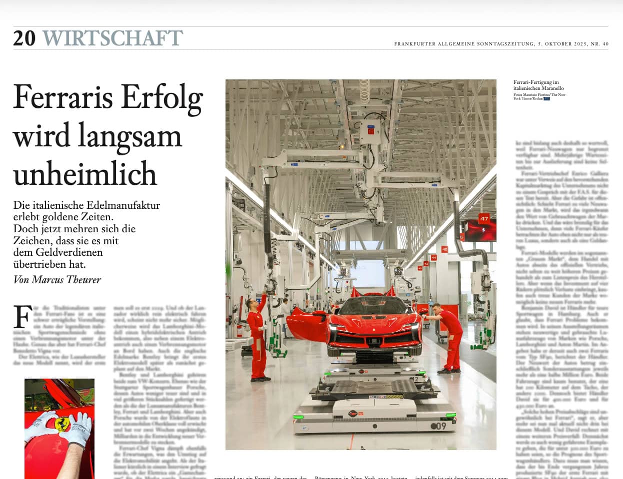 Die Frankfurter Allgemeine Sonntagszeitung berichtet über den Erfolg der italienischen Edelmanufaktor Ferrari. Das Foto dazu zeigt Techniker an einem Auto in der Fabrik und wurde von aufgenommen.