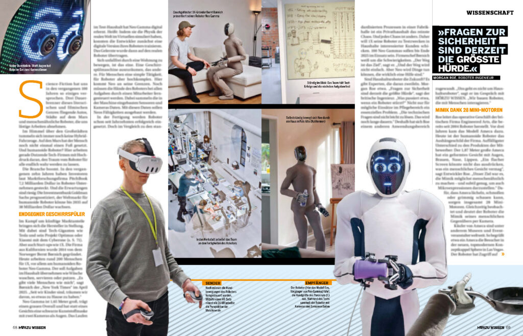 Expert:innen sind sich sicher: Humanoide Maschinen gehört die Zukunft. Ein Artikel dazu wurde auf drei Doppelseiten in der Hörzu Wissen mit Bildern von David B. Torch & Loren Elliott/The New York Times/Redux/laif veröffentlicht.